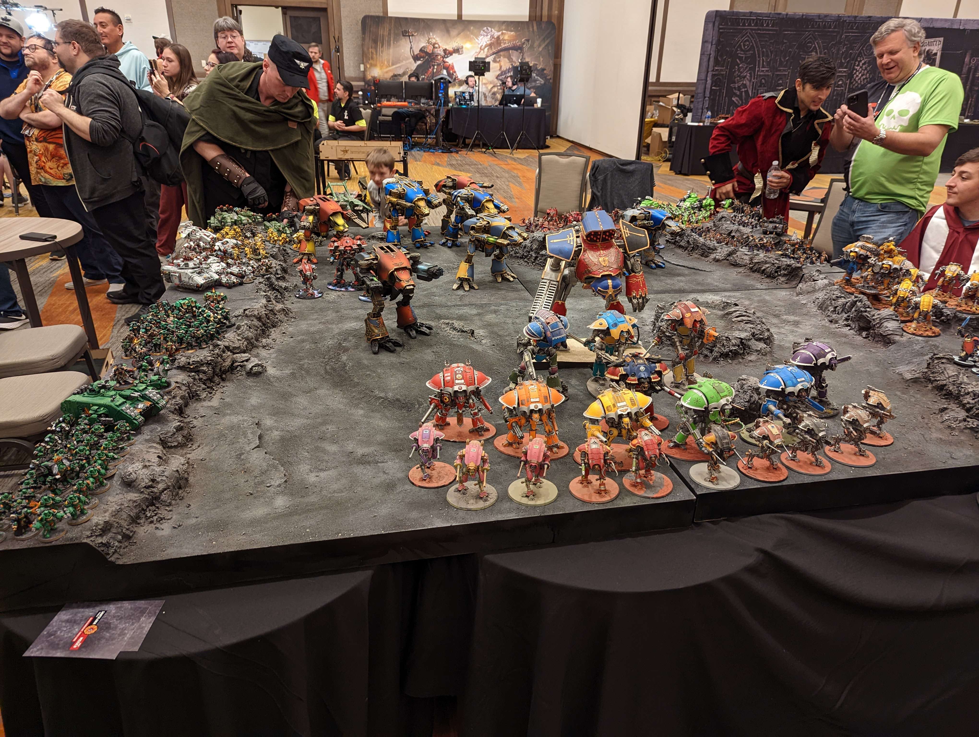 Those both tie into the other ideas that fellow gamers got excited about, which was leading some of the games off with desperate last stands against numerically superior foes, with a player just holding out as long as they can against multiple opponents. What also came up was multi-faction battles with three or more competing players on the same table. They had a big reveal on the last day where key players were invited for an apocalypse-style showdown with several titans, it would have been nice for all the players to have some similarly big battle. Those thoughts are all ways to add a bit more spice to the overall gaming experience.