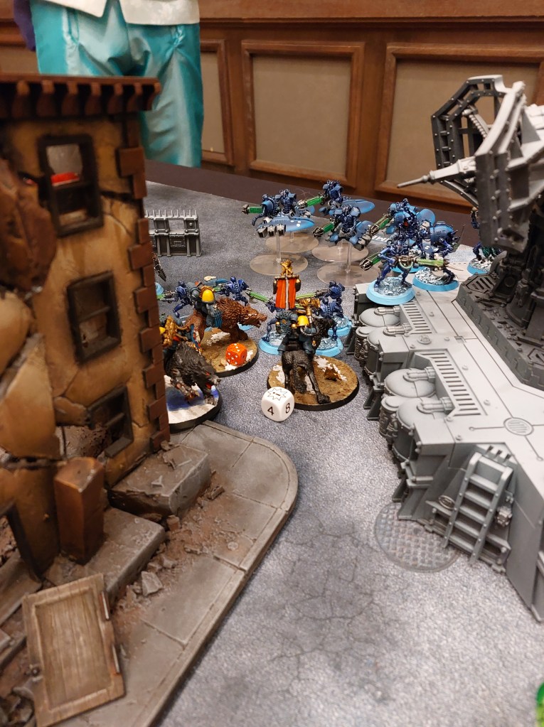 We could bring about 150 Power Level (3000 points) worth of units, and all the games were played at a smaller level so for the games I could have picked different units based off scenario or opponent. I didn’t do that, in part because I already had army lists done up and in part because it gave me an opportunity to field multiple units of Thunderwolf Cavalry (which if you don’t know what they are, think giant super soldiers in power armor riding on wolves bigger than Clydesdales). They are about as crazy a unit as you can find in the 40k universe, they charge across the table and they rip units apart in the name of the God Emperor of Mankind.