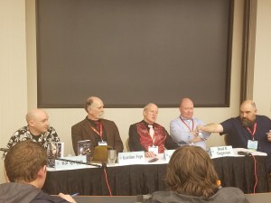 Saturday I also had a panel with Larry Correia, Quincy Allen, John Harness, and Lydia Sherrer on building a new monster. Poor Larry had no idea that he had been made moderator. Lydia was the one who’d had the idea for the panel and she stepped in well to get us started and back on track. It was a tremendously fun panel topic and the audience was great.